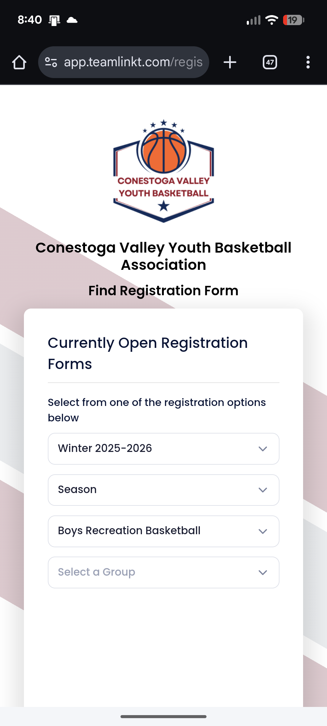 If you are on a mobile device, you may need to reselect the season and team to get the app to move forward with the registration process.